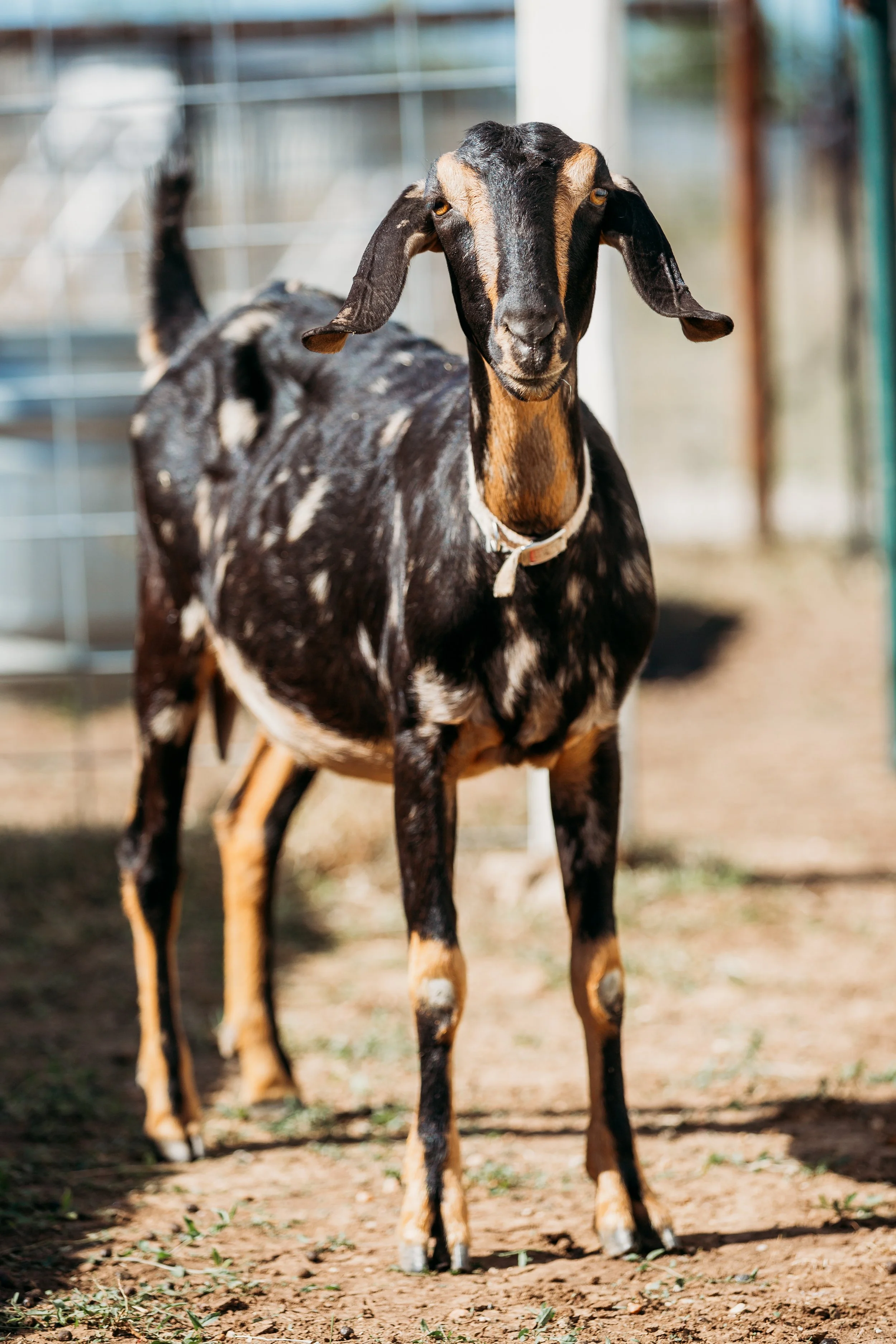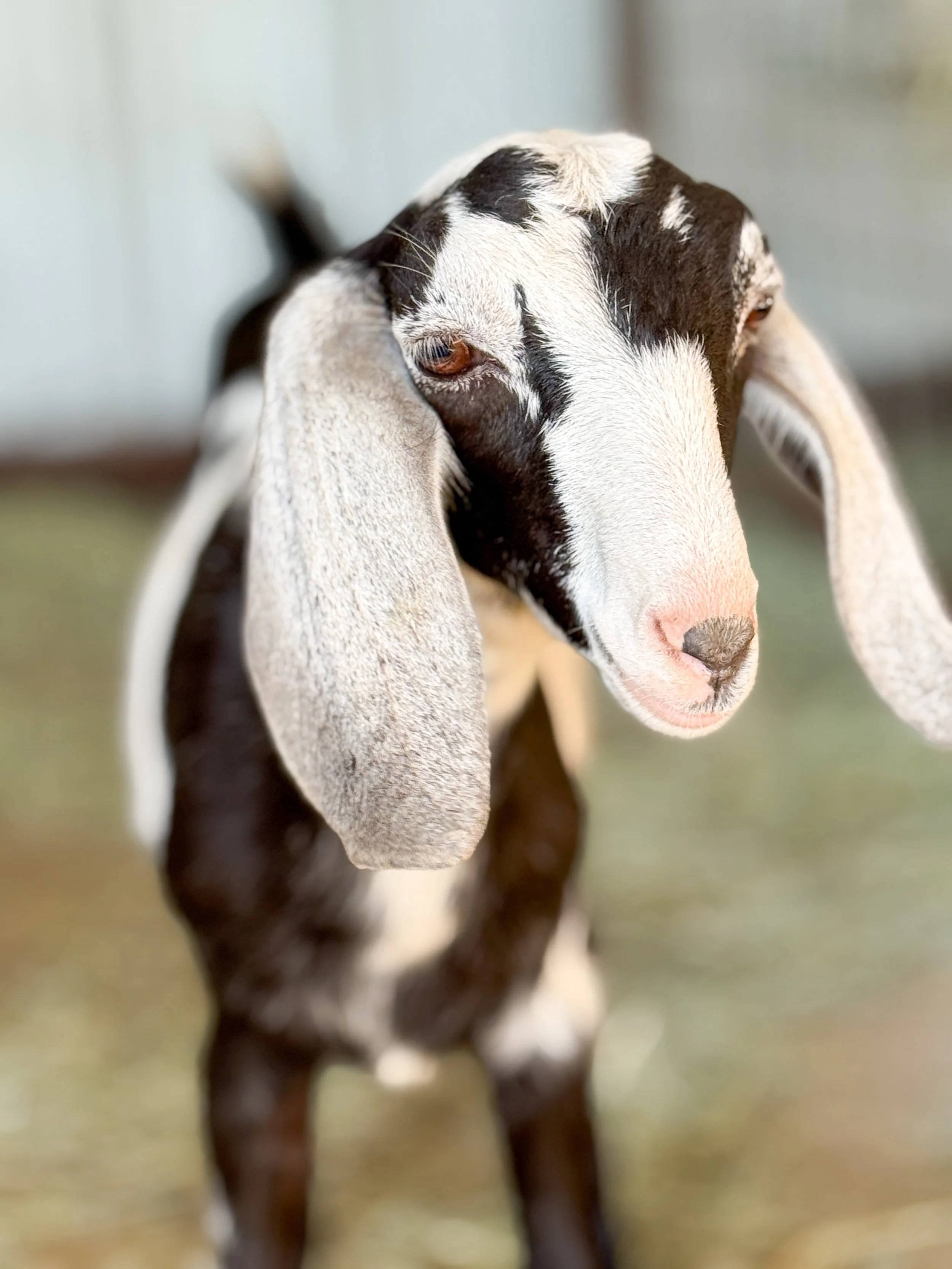 Gretel is disbudded with pendulous ears, black and brown with heavy roaning, random white, white poll