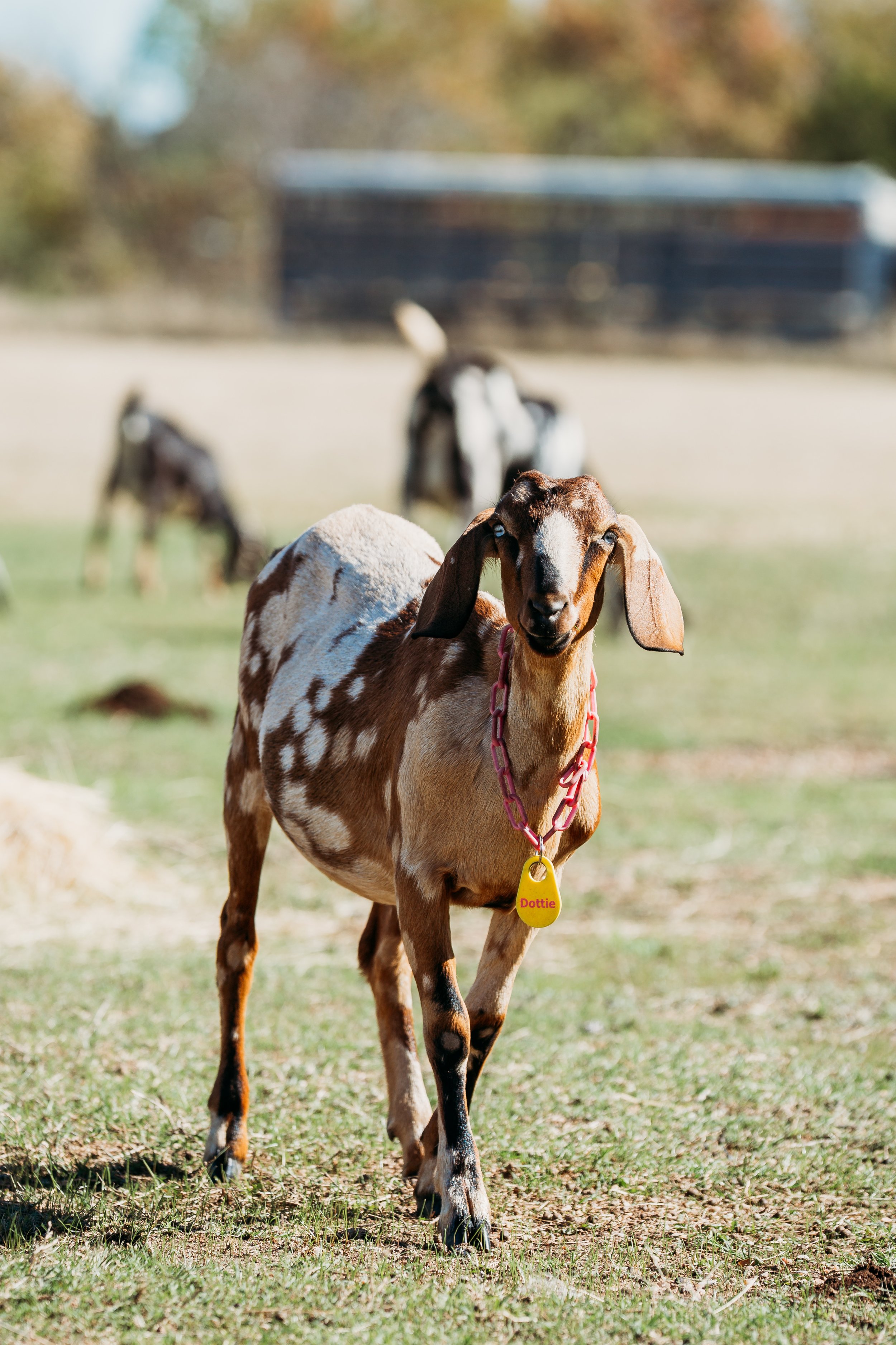 Dottie is polled with pendulous ears, bezoar with heavy moonspotting and blue eyes