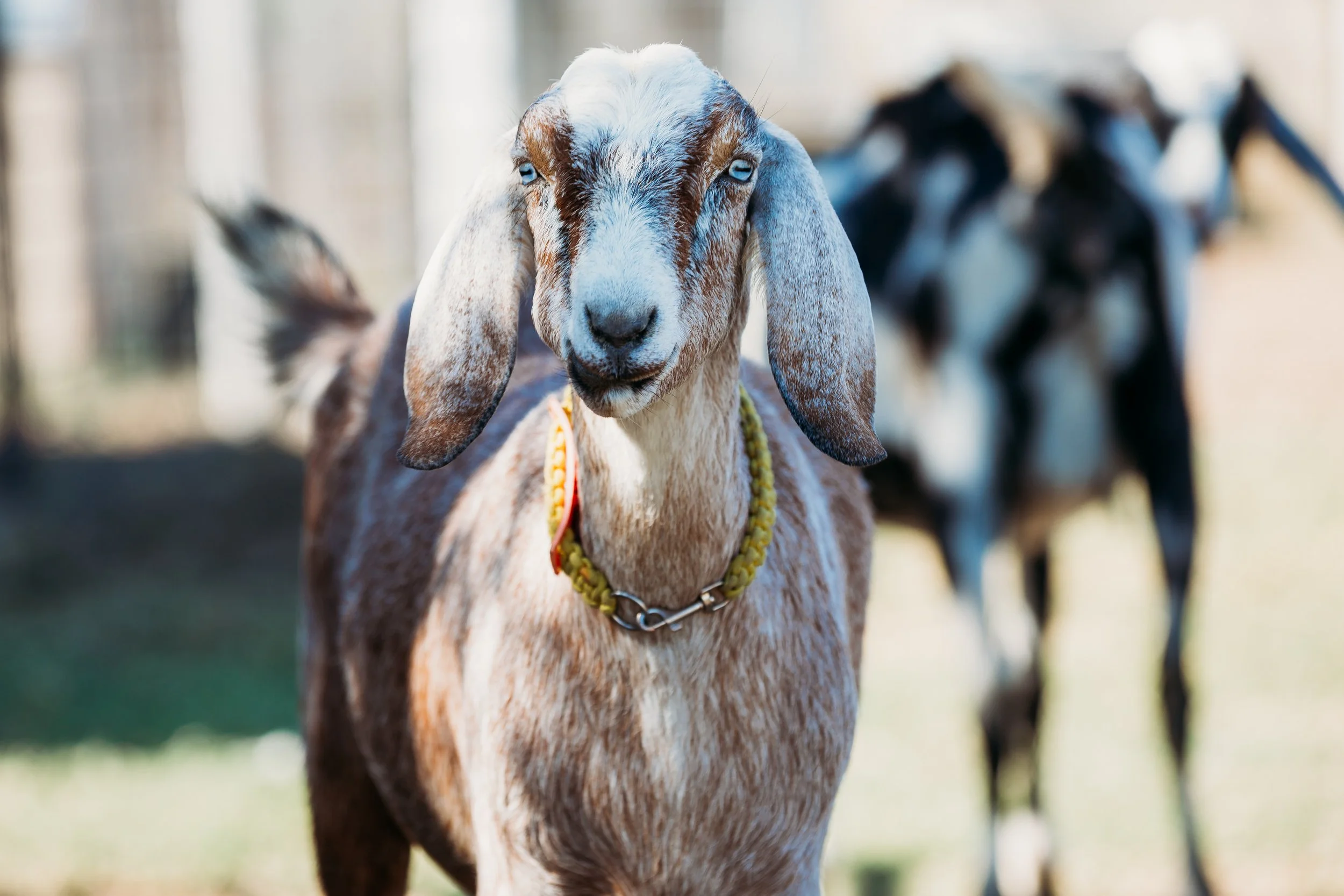 Lulu is disbudded with pendulous ears, light bezoar with heavy roaning, white poll, blue eyes